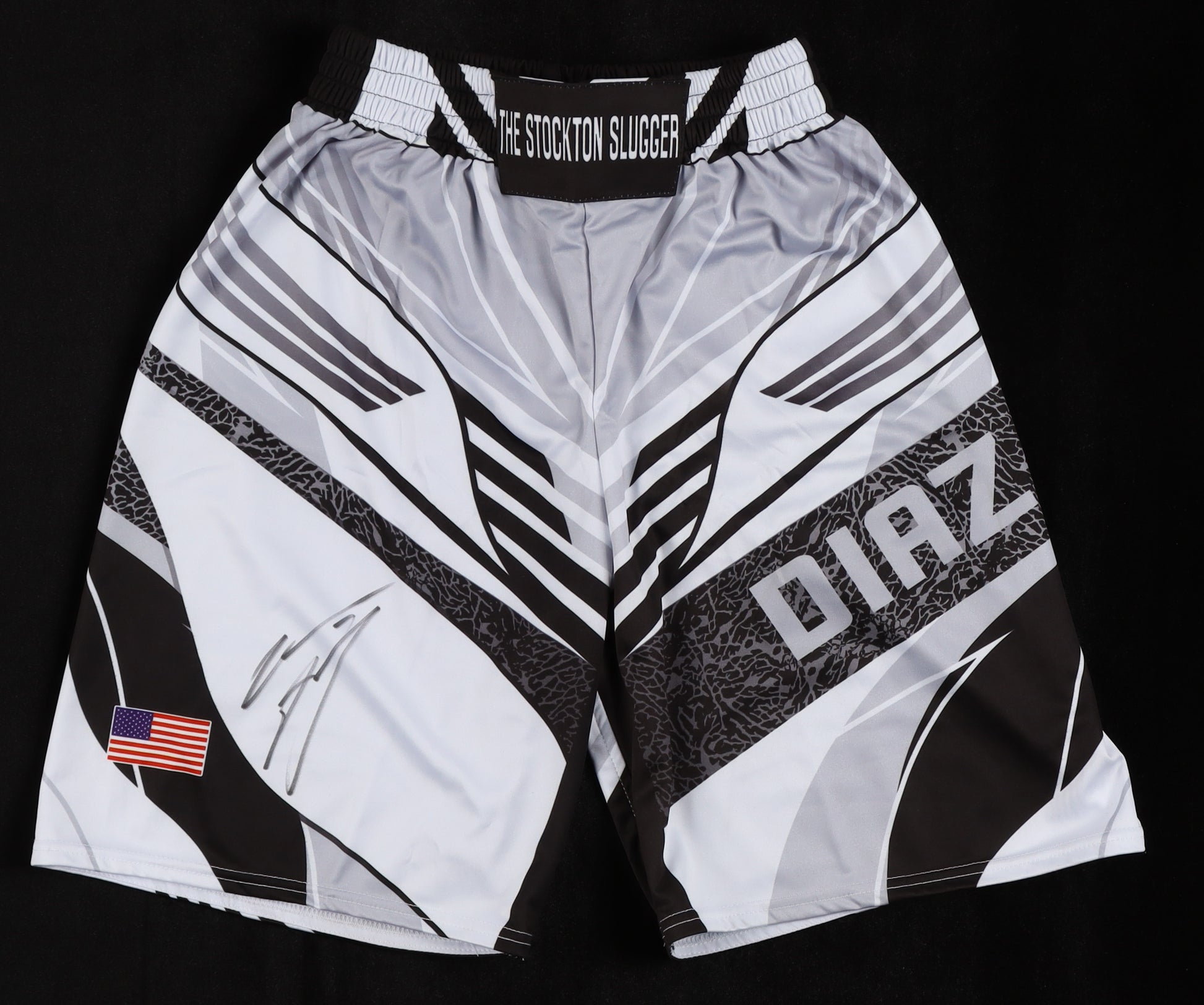 Custom Fight Shorts: Unique design celebrating Diaz’s Stockton roots, perfect for display.