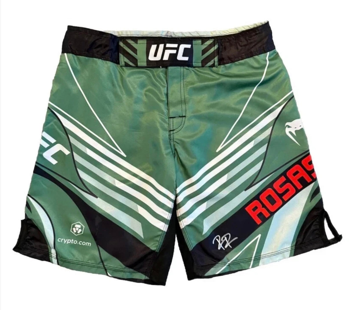 Keywords: Raul Rosas Jr., UFC, signed Venum trunks, PSA authenticated, UFC collectible, MMA memorabilia, autographed trunks, Venum fight gear, young UFC star.